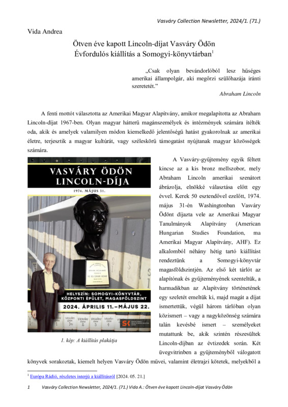 Vida Andrea - Ötven éve kapott Lincoln-díjat Vasváry Ödön. Évfordulós kiállítás a Somogyi-könyvtárban -