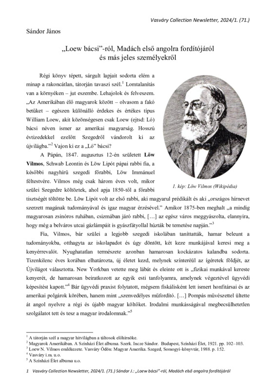 Sándor János - „Loew bácsi”-ról, Madách első angolra fordítójáról és más jeles személyekről -